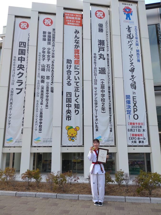烈蹴会の瀬戸丸 遥選手が、7月28日(日)にサイデン化学アリーナ(さいたま市)で行われた「第17回 全日本ジュニアテコンドー選手権大会」で優勝したことを報告するためです。
