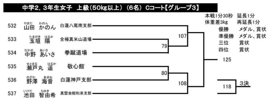 烈蹴会からは、瀬戸丸 遥選手が「中学2・3年生女子 上級(50kg以上)」で出場。