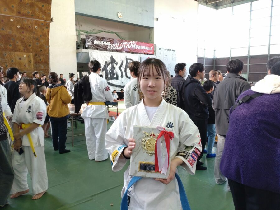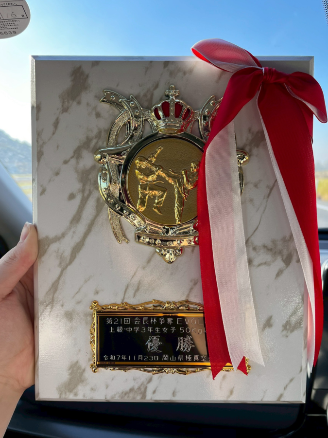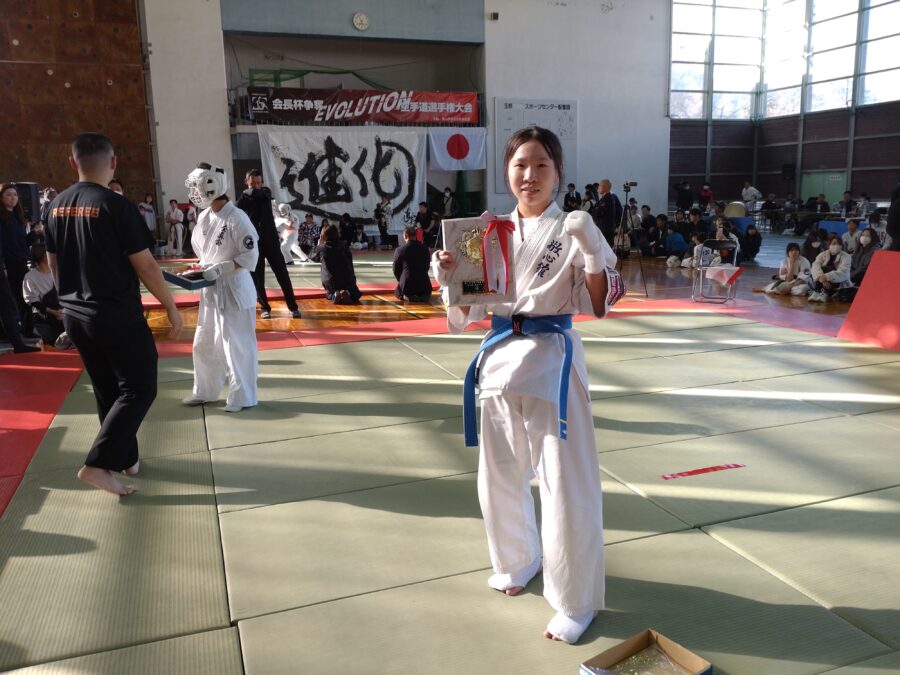 フルコンタクト空手ではトロフィーが多いので、盾をいただいて遥選手もうれしそうでした。(*^^*)