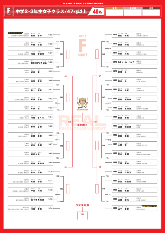 これは昨年までとは大会のやり方を変え、ベスト8までは1日目、それ以降の試合は2日目と分け、人数が少ない階級(最初からベスト8以内)の選手たちがいなかったからと思います。